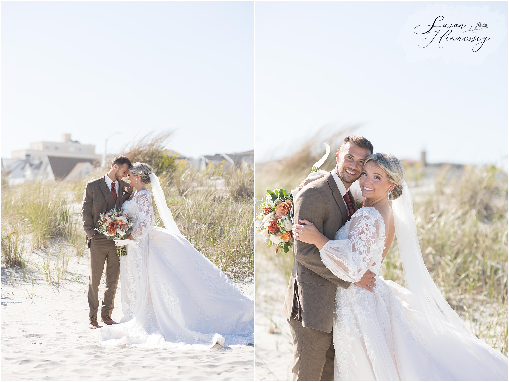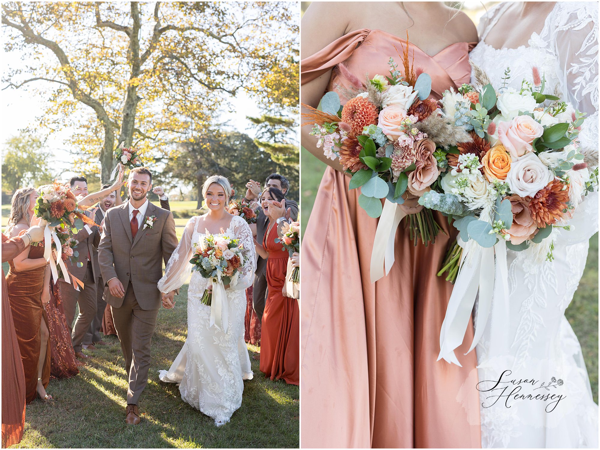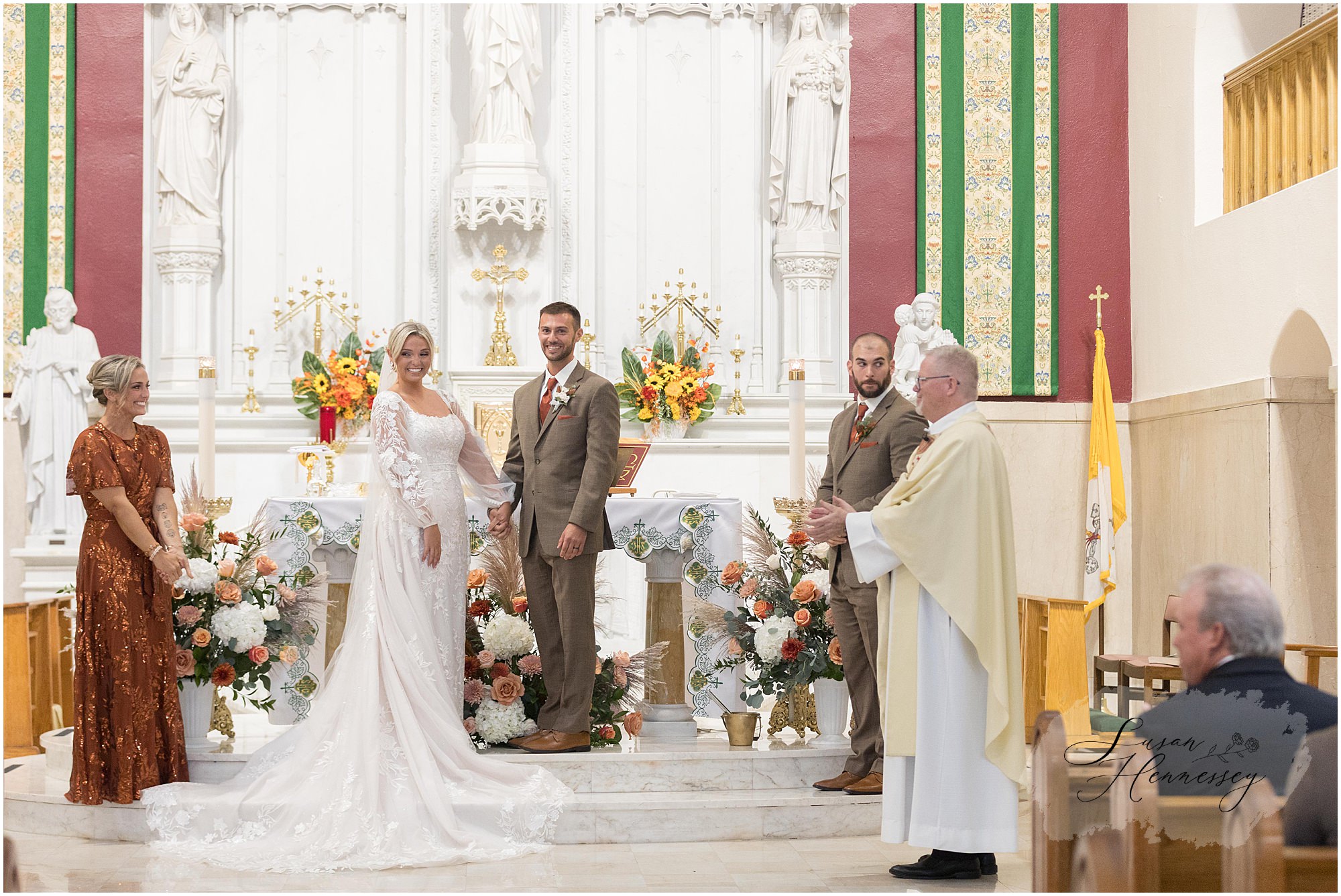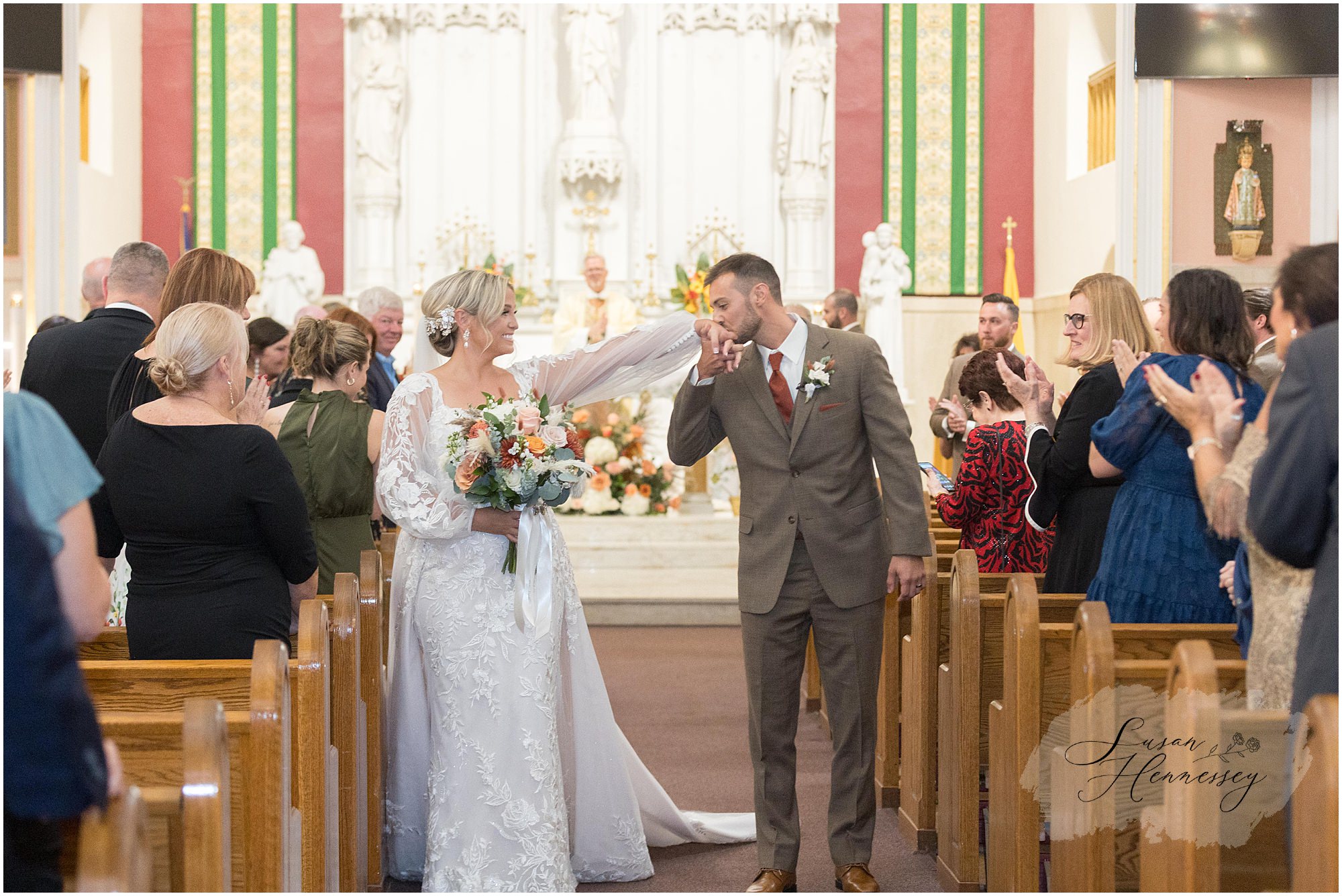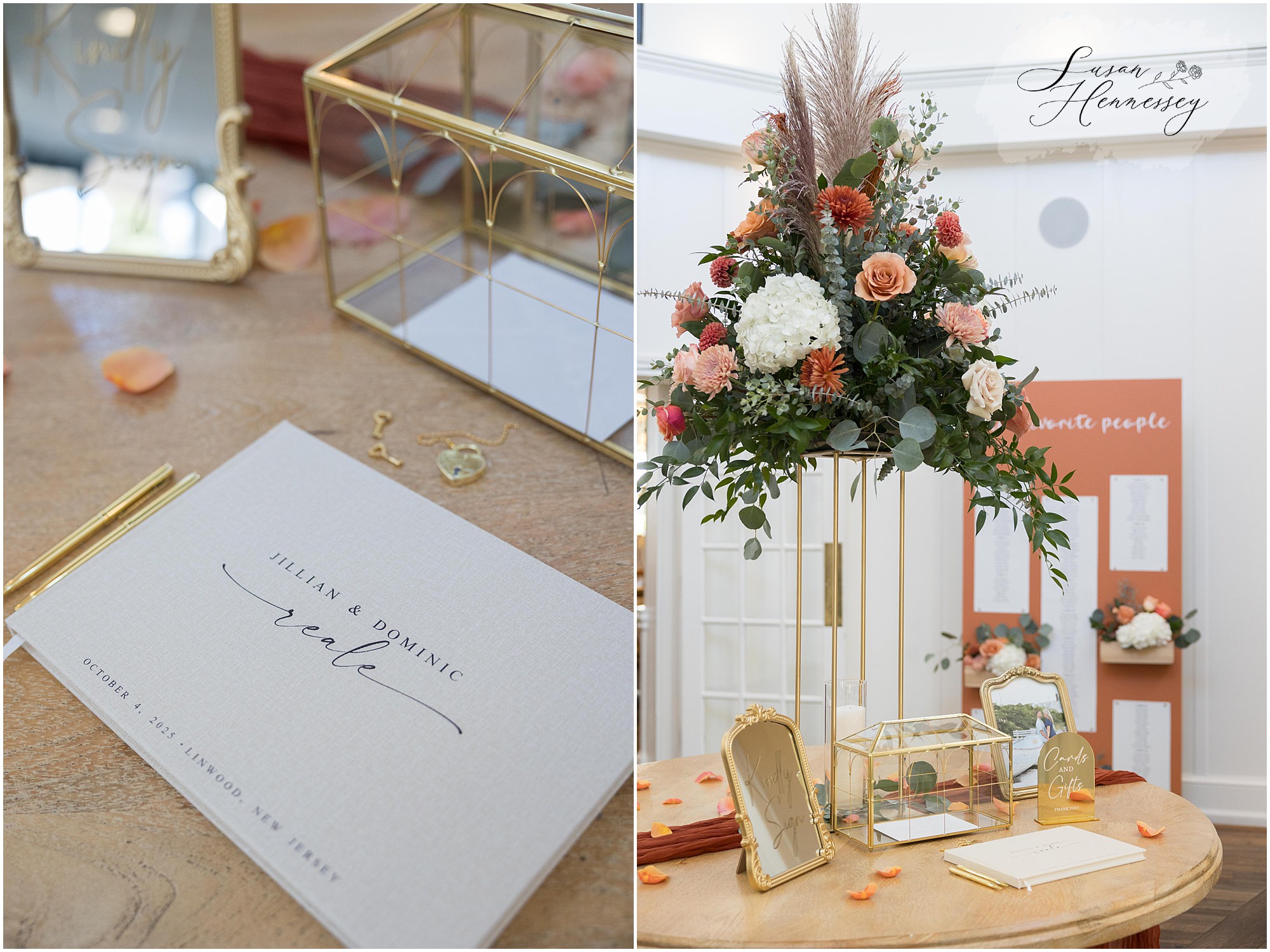 Jillian and Dominic’s October wedding at Linwood Country Club in Linwood, NJ was the perfect blend of rustic boho charm and heartfelt family moments. Their day was filled with warm autumn tones with a burnt orange, sage green, and creamy neutral color palette that beautifully complemented the fall setting. The celebration began with a traditional church ceremony at St. James Roman Catholic Church in Ventnor City, NJ and since the church was just a block from the beach, we couldn’t resist stopping for portraits by the shore! The soft ocean breeze, golden light, and quiet sand made for the most romantic Jersey Shore wedding photos, a nod to a place that means so much to them.