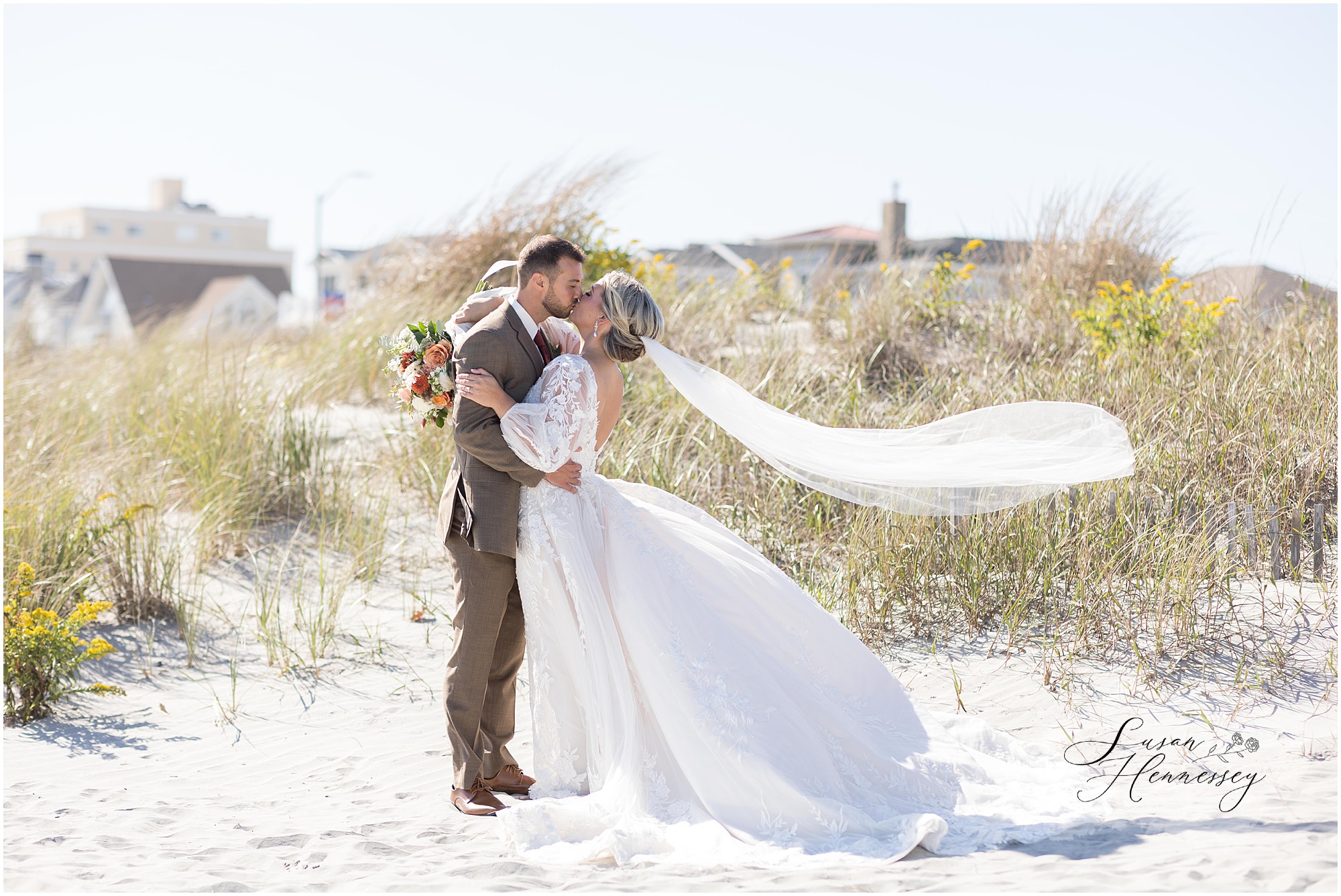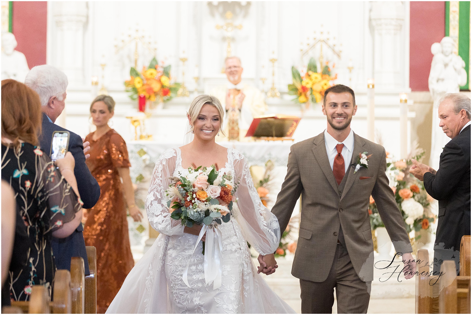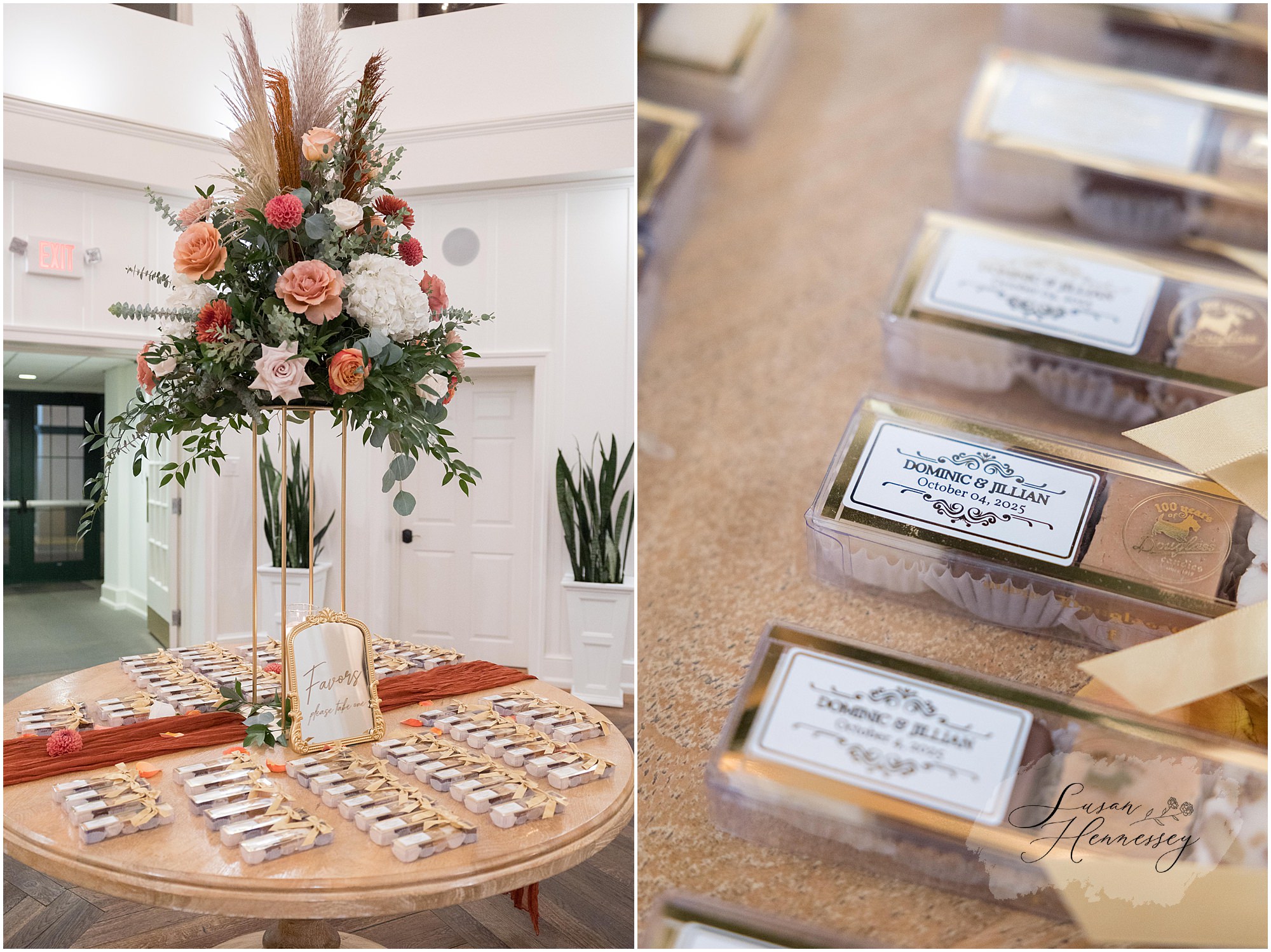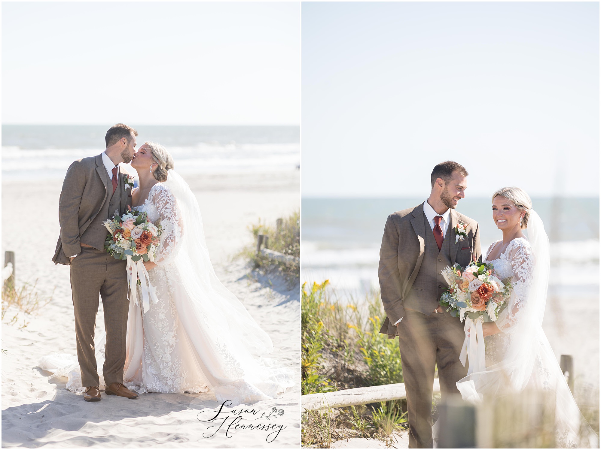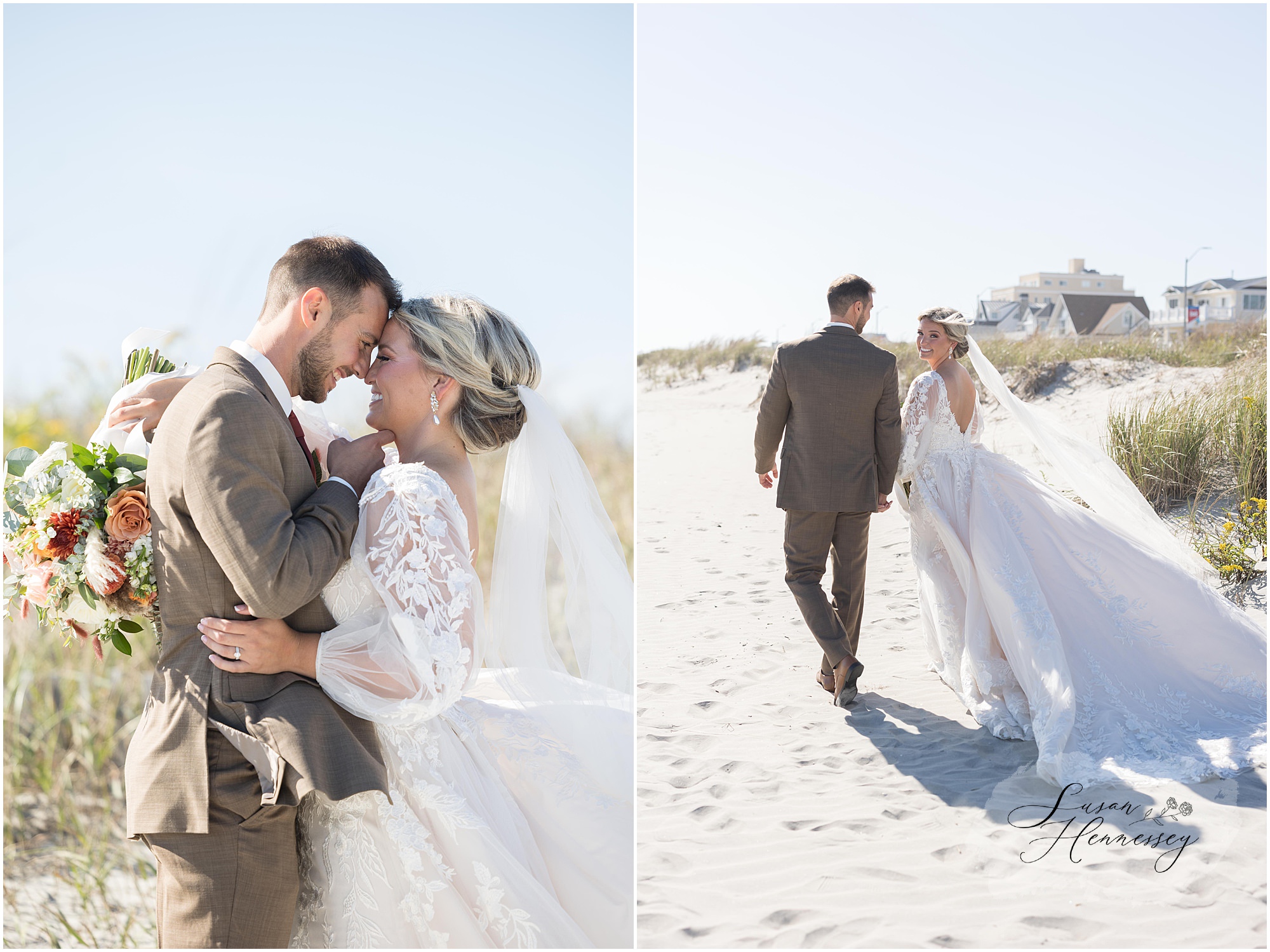 Jillian and Dominic’s October wedding at Linwood Country Club in Linwood, NJ was the perfect blend of rustic boho charm and heartfelt family moments. Their day was filled with warm autumn tones with a burnt orange, sage green, and creamy neutral color palette that beautifully complemented the fall setting. The celebration began with a traditional church ceremony at St. James Roman Catholic Church in Ventnor City, NJ and since the church was just a block from the beach, we couldn’t resist stopping for portraits by the shore! The soft ocean breeze, golden light, and quiet sand made for the most romantic Jersey Shore wedding photos, a nod to a place that means so much to them.