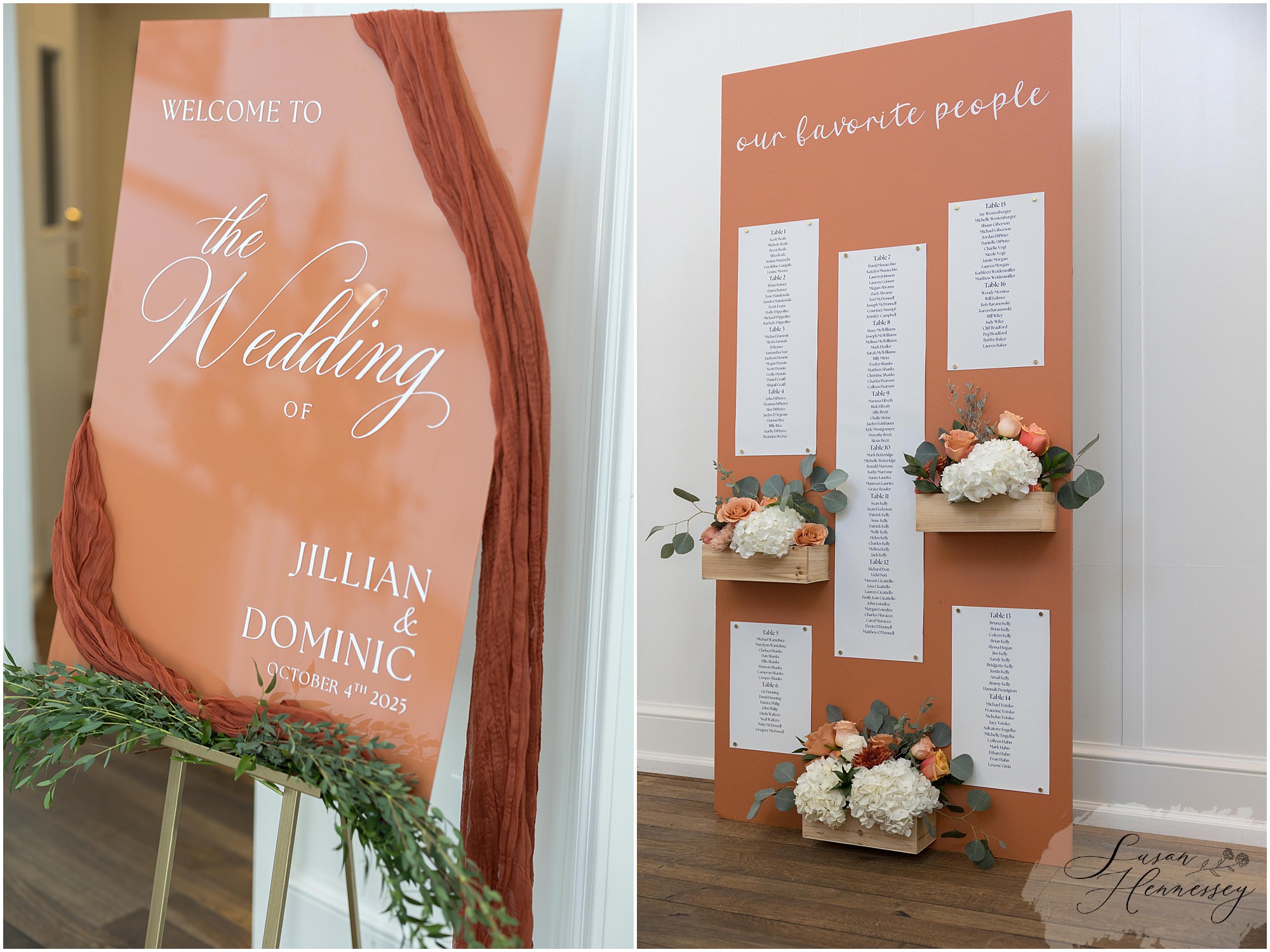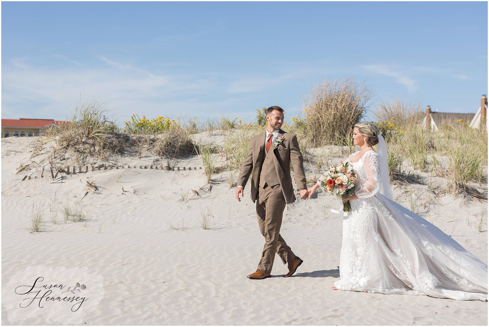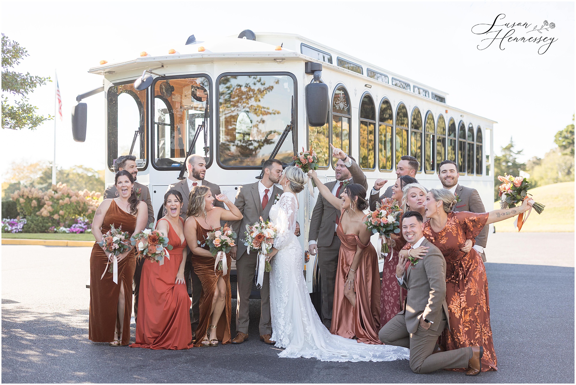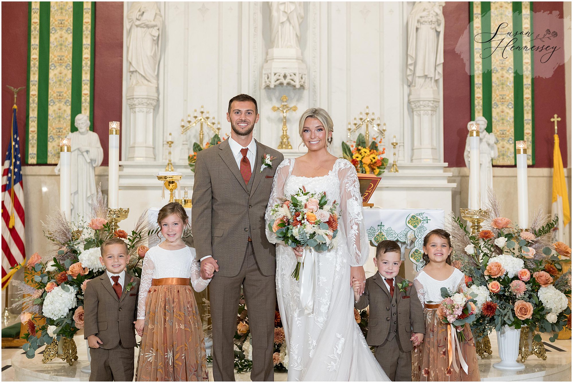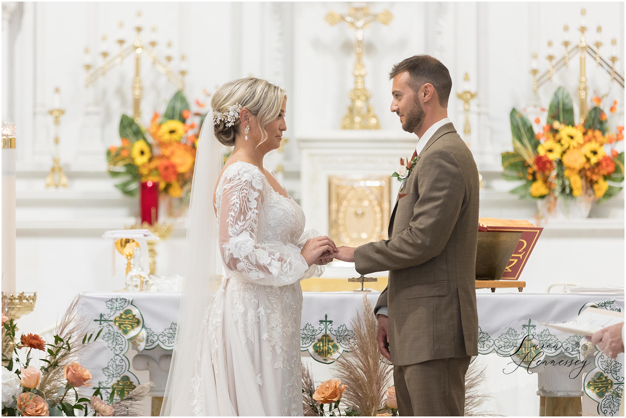 Jillian and Dominic’s October wedding at Linwood Country Club in Linwood, NJ was the perfect blend of rustic boho charm and heartfelt family moments. Their day was filled with warm autumn tones with a burnt orange, sage green, and creamy neutral color palette that beautifully complemented the fall setting. The celebration began with a traditional church ceremony at St. James Roman Catholic Church in Ventnor City, NJ and since the church was just a block from the beach, we couldn’t resist stopping for portraits by the shore! The soft ocean breeze, golden light, and quiet sand made for the most romantic Jersey Shore wedding photos, a nod to a place that means so much to them.